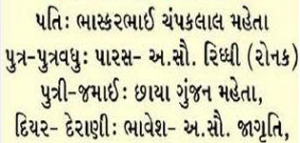 Obituary Of Ranjanaben Bhasakarbhai Mehta
